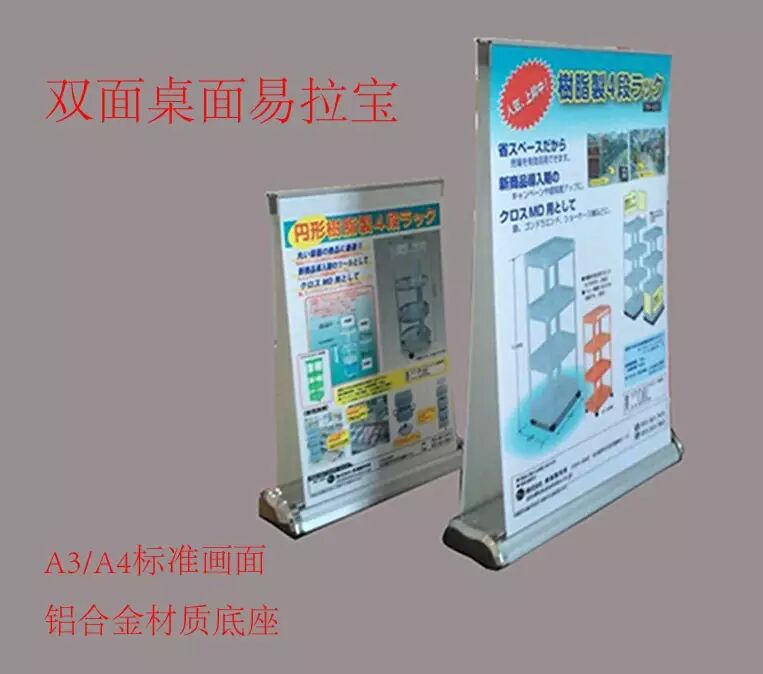 鹰牌展架还有双面桌面易拉宝,可以正反双面展示您的产品,款式新颖独特,节省展示空间.